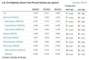 As of August 22, the cost of diesel sits at $4.909 per gallon. According to AAA, the highest price for diesel was $5.816 per gallon on June 19, which is 84.3 cents higher than the current price. The AAA also publishes data for each state, whereas the EIA publishes data by region and sub region.